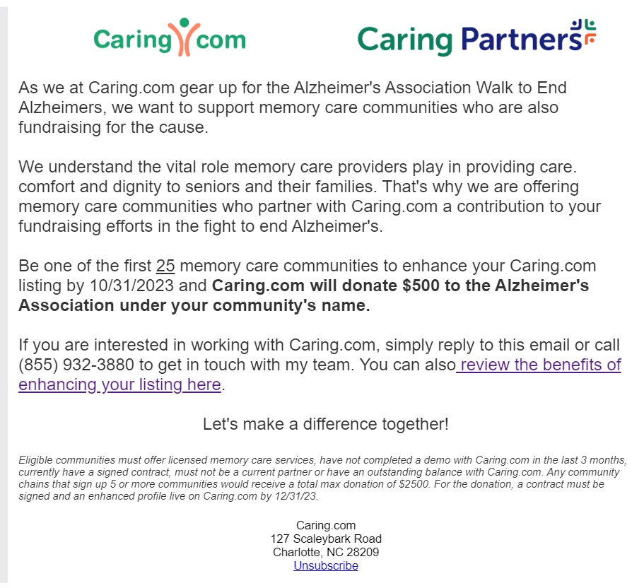 - Donation incentive: Larger memory care communities were offered a donation to their Alzheimer’s Walk if they partnered with us.